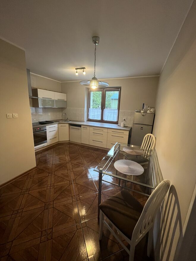 Piętro: salon z wyjściem na taras, 2 pokoje, duża kuchnia z jadalnią, łazienka z wanną i toaletą